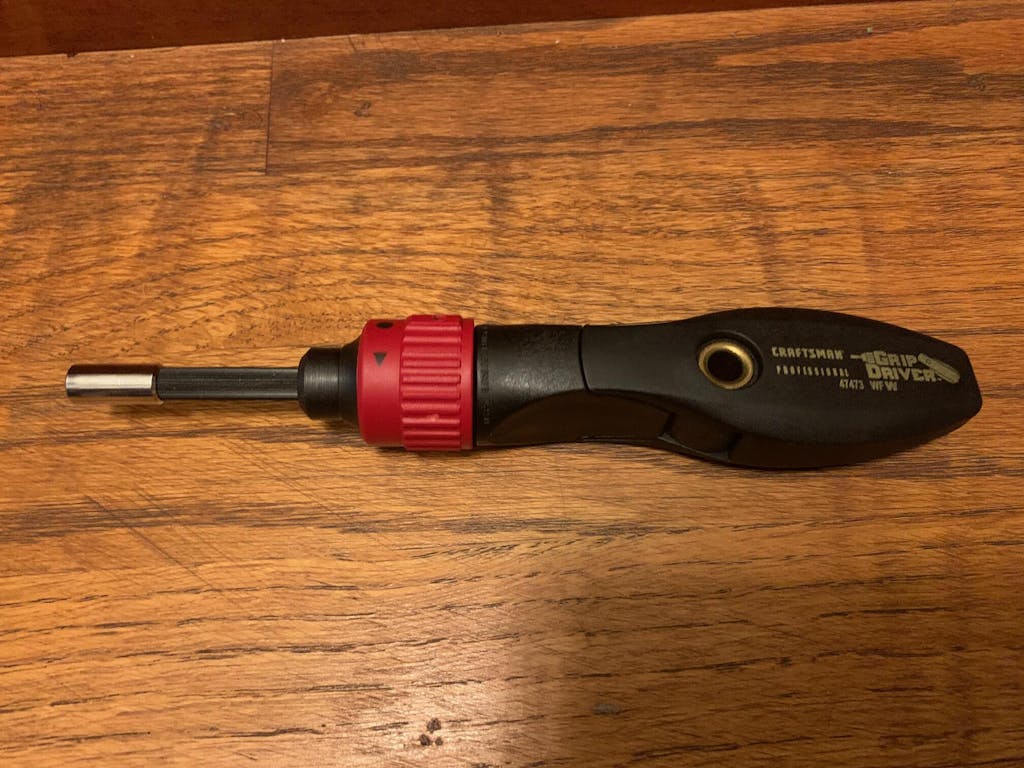 Craftsman Professional Reversible Ratcheting Grip Driver. Magnetic bit holder. Handle bends down to offset and snaps back to straight. Screwdriver originally made by Schroeder Tools. ///brand_for_product_detail=Craftsman,close_out=Yes,companydescription=Craftsman - Made in Germany,condition=New,condition_google=new,cost=2.000000,countrymade=Made in Germany,country_flag=no_selection,featured=0,flag=no_selection,identifier_exists=0,instock=in stock,is_recurring=0,listprice=6.00,manufacture_country=Germany,product_image_size=Default,product_page_type=Default,sellprice=12.50,shopping_ad_bestseller=Yes,smart_campaign_bestsellers=Smart Campaign Bestsellers,square_product_image=https://square-production.s3.amazonaws.com/files/903b26c2132b3b4256e8ed59fcb666ef8e7a7cfe/original.jpeg,store_price=12.500000,sw_featured=No,sync_update_msg=Modified in Magento by harryepstein on 29/03/2017,url_path=craftsman-professional-grip-driver, 03 09 P