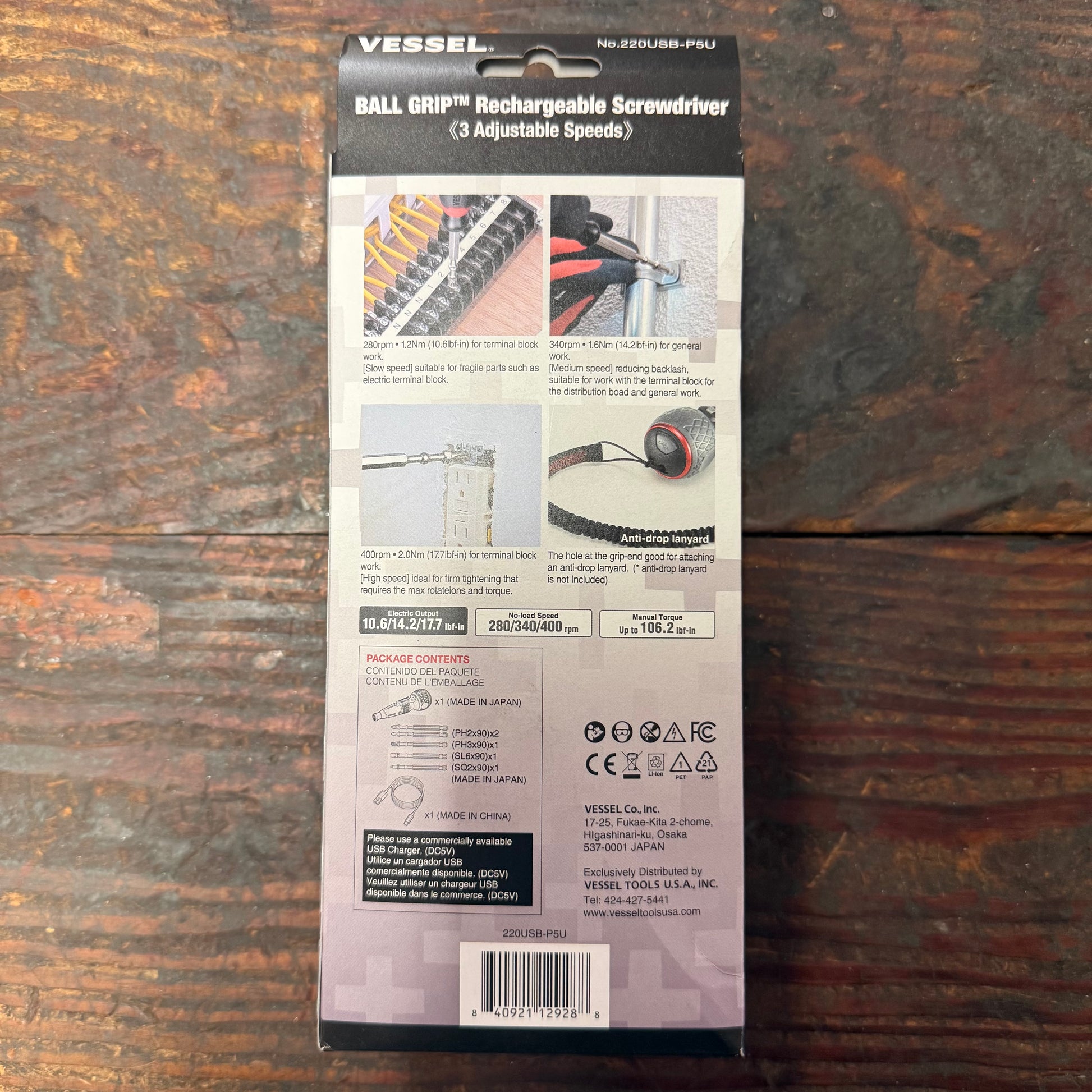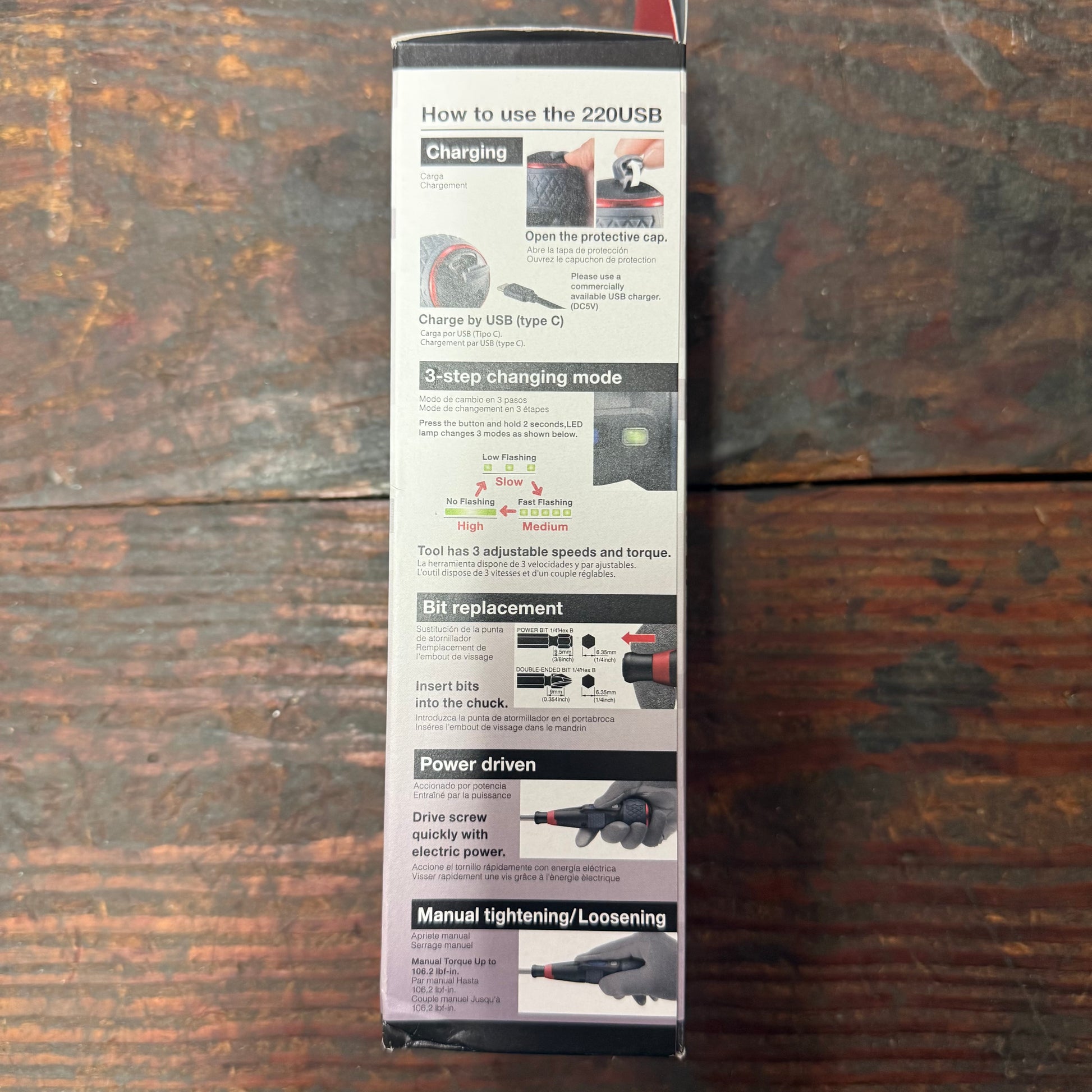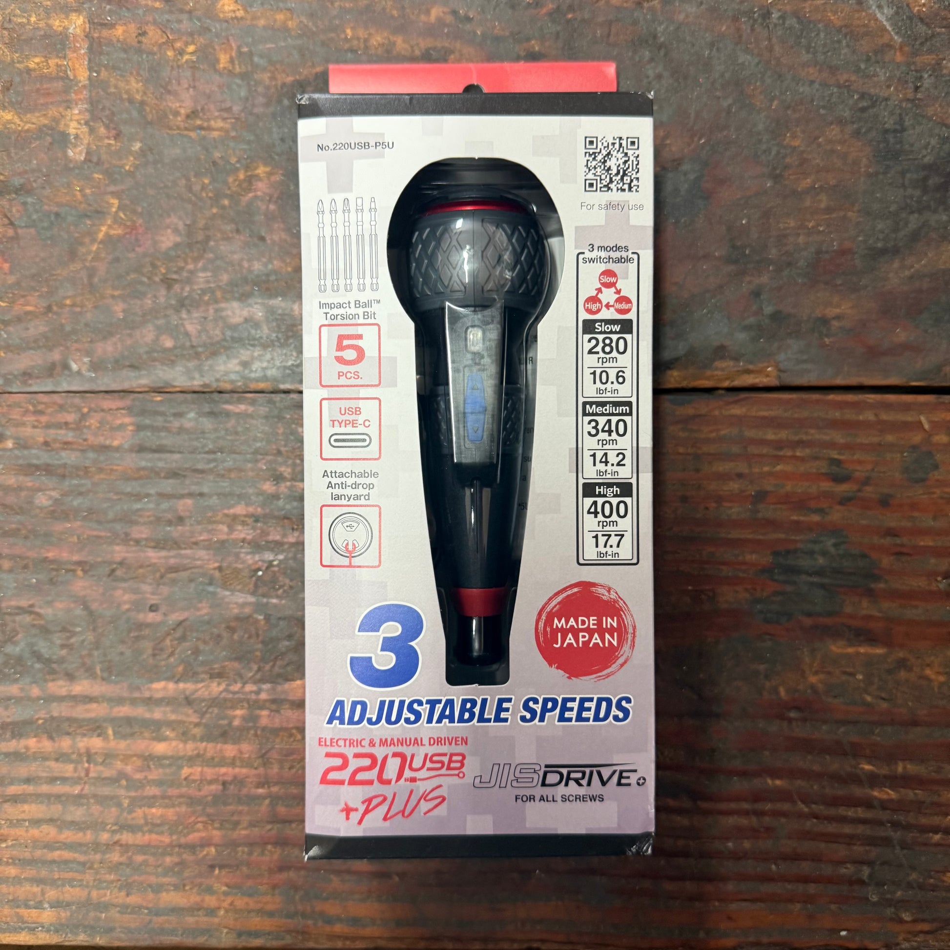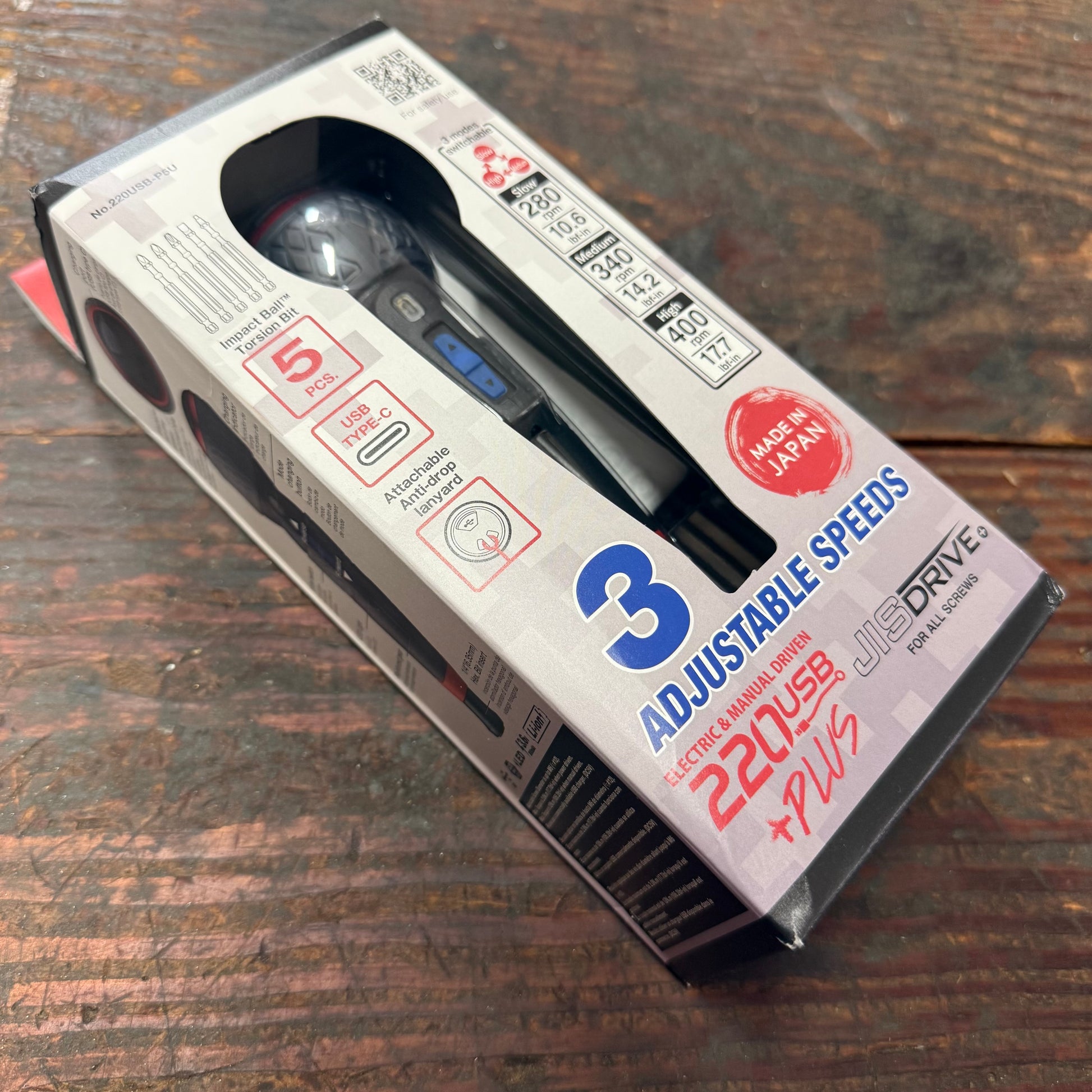 The 220USB-P5U cordless rechargeable Ball Grip screwdriver provides 3 different speeds and features: